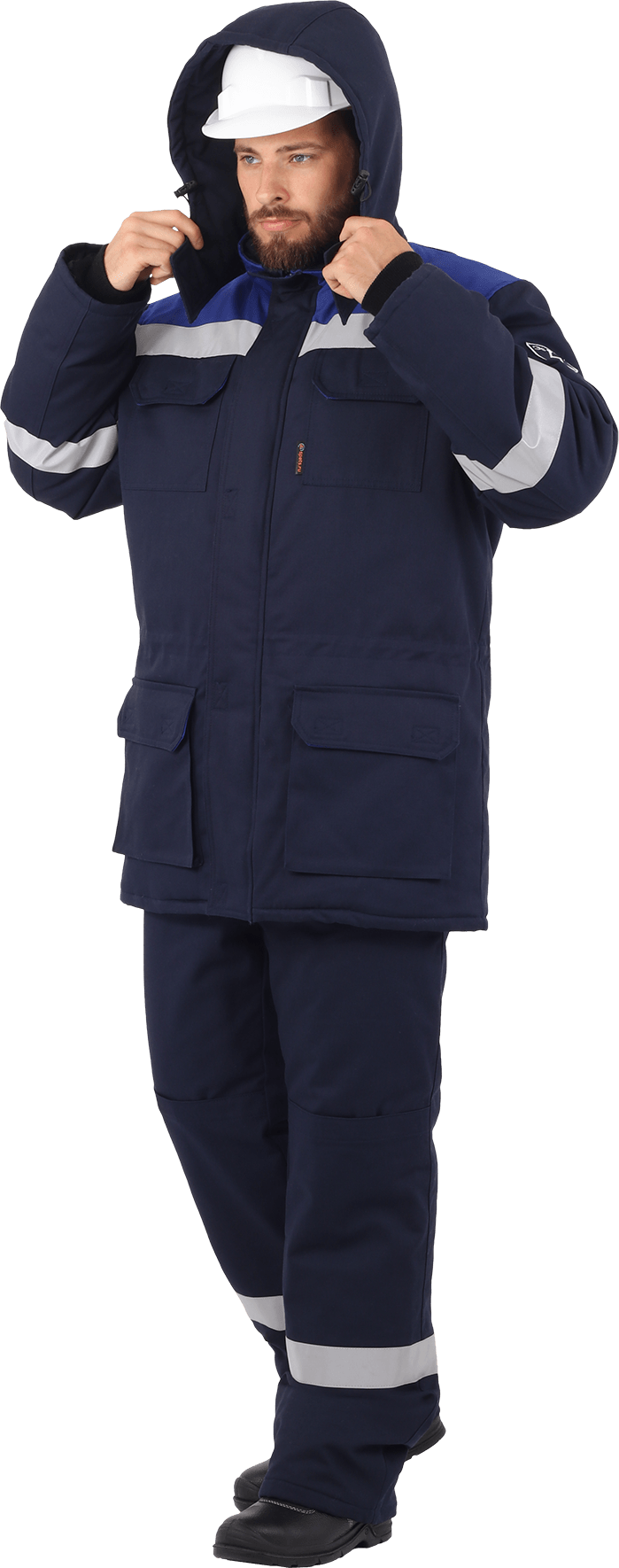 Ткань верха: Эксперт-Стандарт СА-25 с антистатической нитью, 80% х/б, 20% полиэстера, пл. 250 г/м², отделка НМВО Подкладка: бязь, 100 % х/б, пл.140 г/м² Ветрозащитная прокладка: 100% п/э Утеплитель: куртка-«Климафорт», 3 слоя, пл. 360 г/м² полукомбинезон-«Климафорт», 2 слоя, пл. 240 г/м² Костюм состоит из куртки и полукомбинезона. В костюме используются ветрозащитная ткань и спанбонд для предотвращения миграции волокон утеплителя. Куртка удлиненная: • центральная застёжка на двухзамковую молнию и клапан с текстильной застёжкой • регулируемый, пристёгивающийся капюшон • полочка с нагрудными и нижними объёмными накладными карманами с фигурными клапанами с застежкой на контактную ленту • объем по линии талии регулируется кулиской с эластичным шнуром • рукава втачные, с внутренними трикотажными манжетами • cветовозвращающая лента шириной 50 мм по кокеткам полочек и спинке, низу рукавов Полукомбинезон: • застёжка на двухзамковую молнию • накладные карманы с наклонным входом • бретели частично с эластичной лентой и застёжками на фастексы • объём спинки регулируется по линии талии эластичной лентой • усилительные накладки на передних половинках в области колен, с карманом для амортизационных вкладышей-наколенников • cветовозвращающая полоса шириной 50 мм по низу наколенника