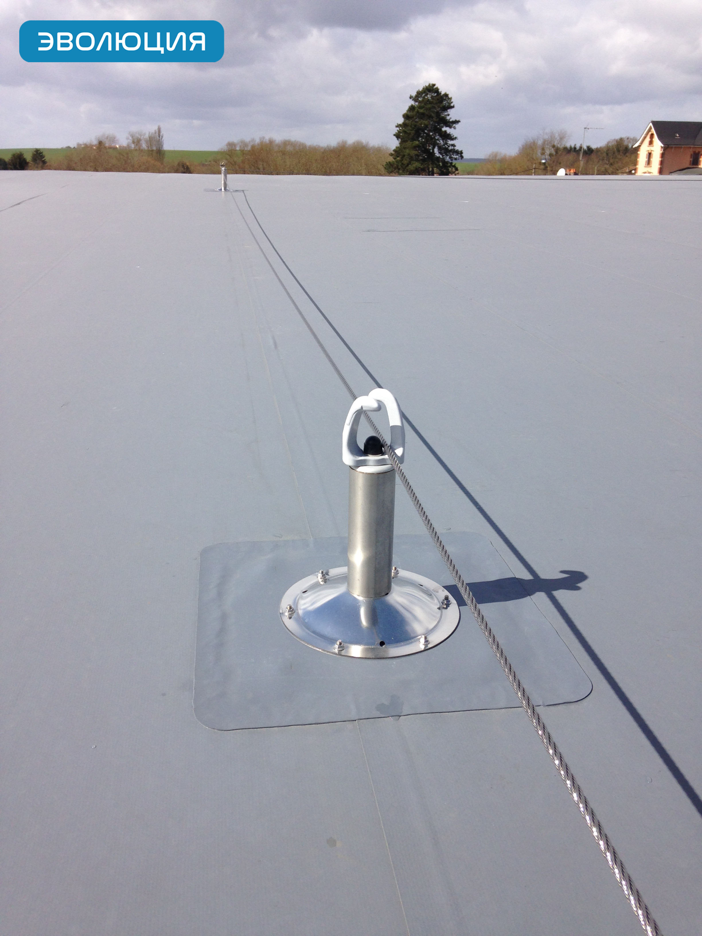 Стационарная страховочная анкерная система от компании «Эволюция» предназначена для организации безопасной работы сотрудников на крышах с покрытием из ПВХ-мембраны при: